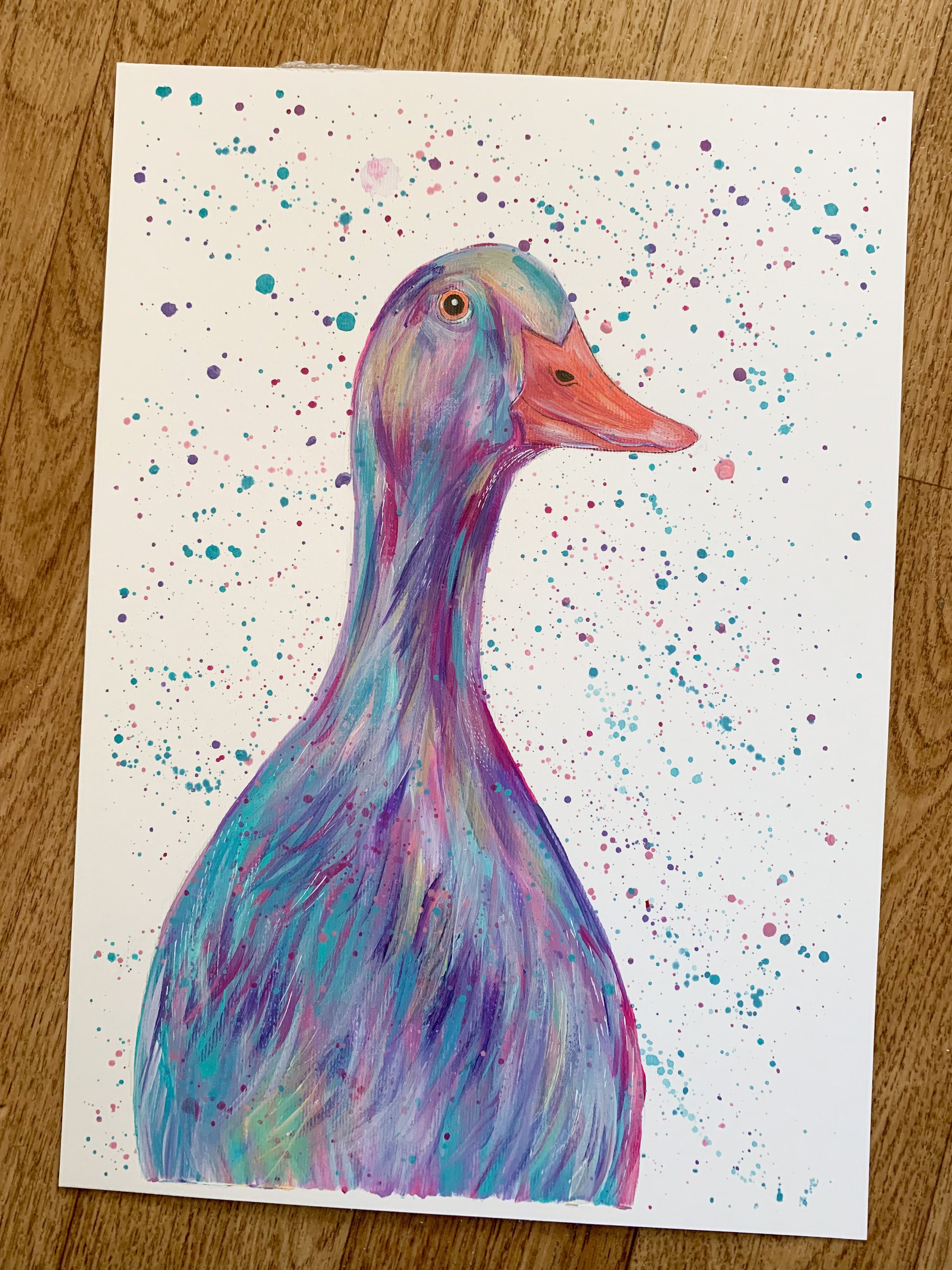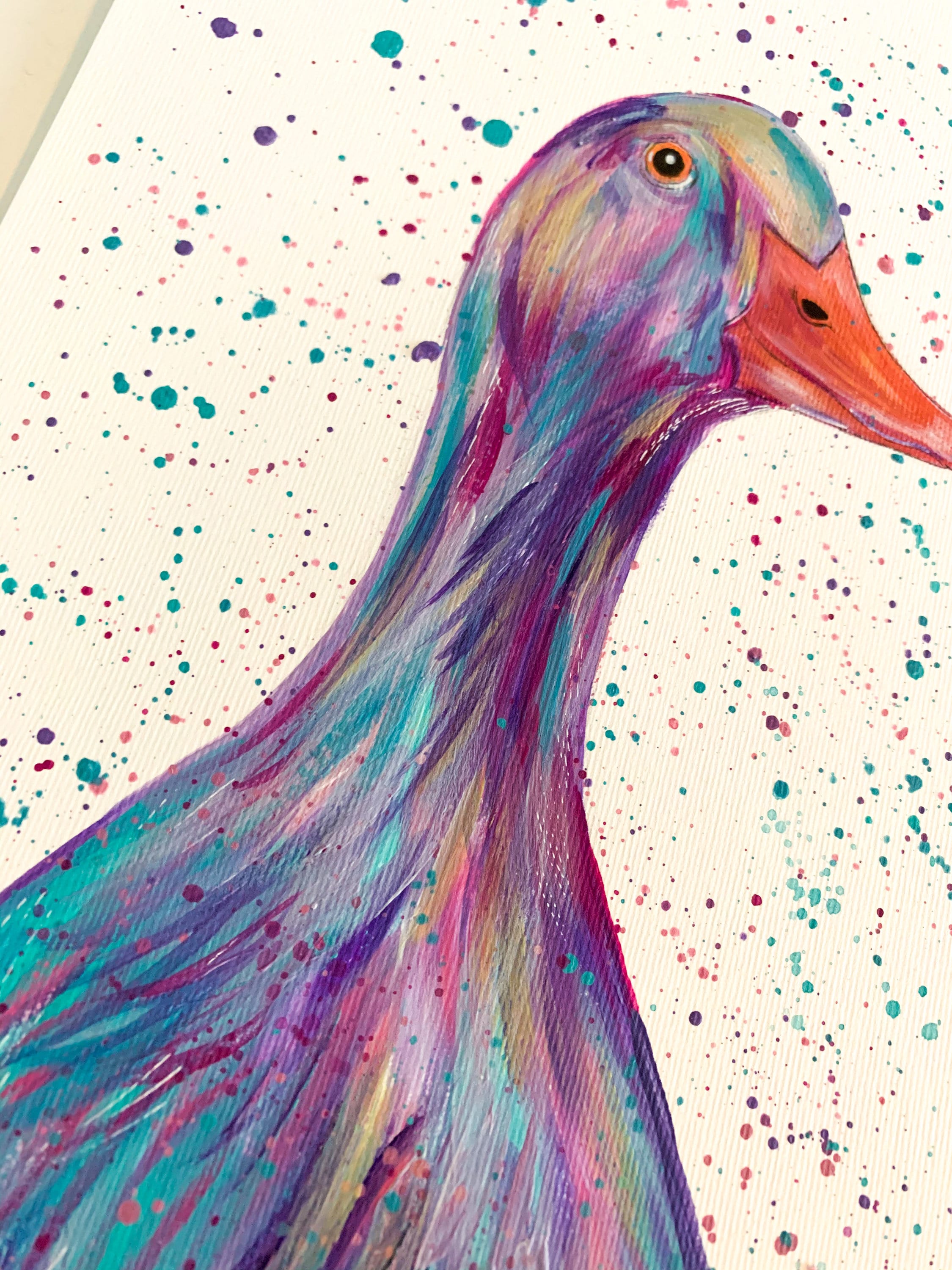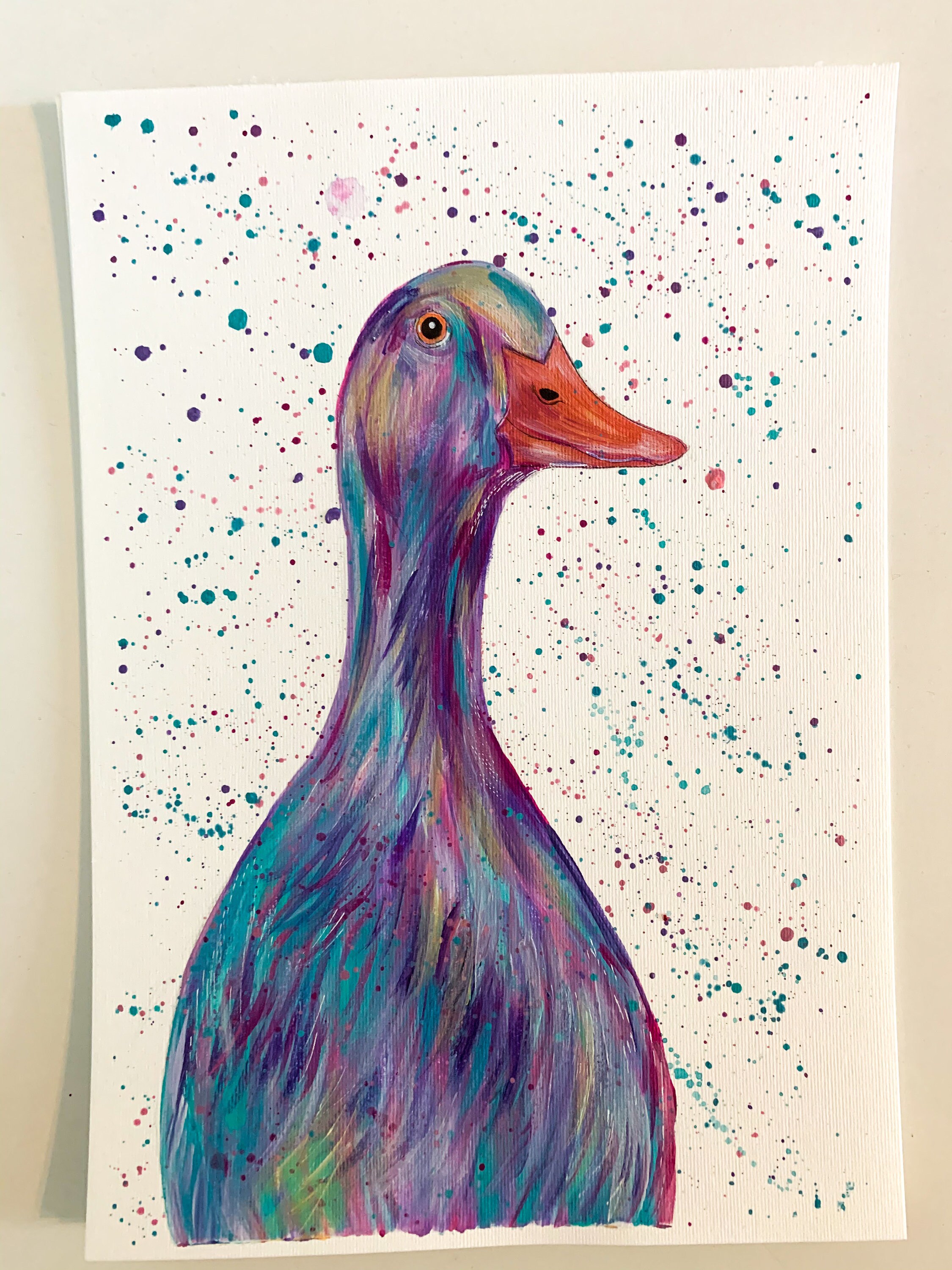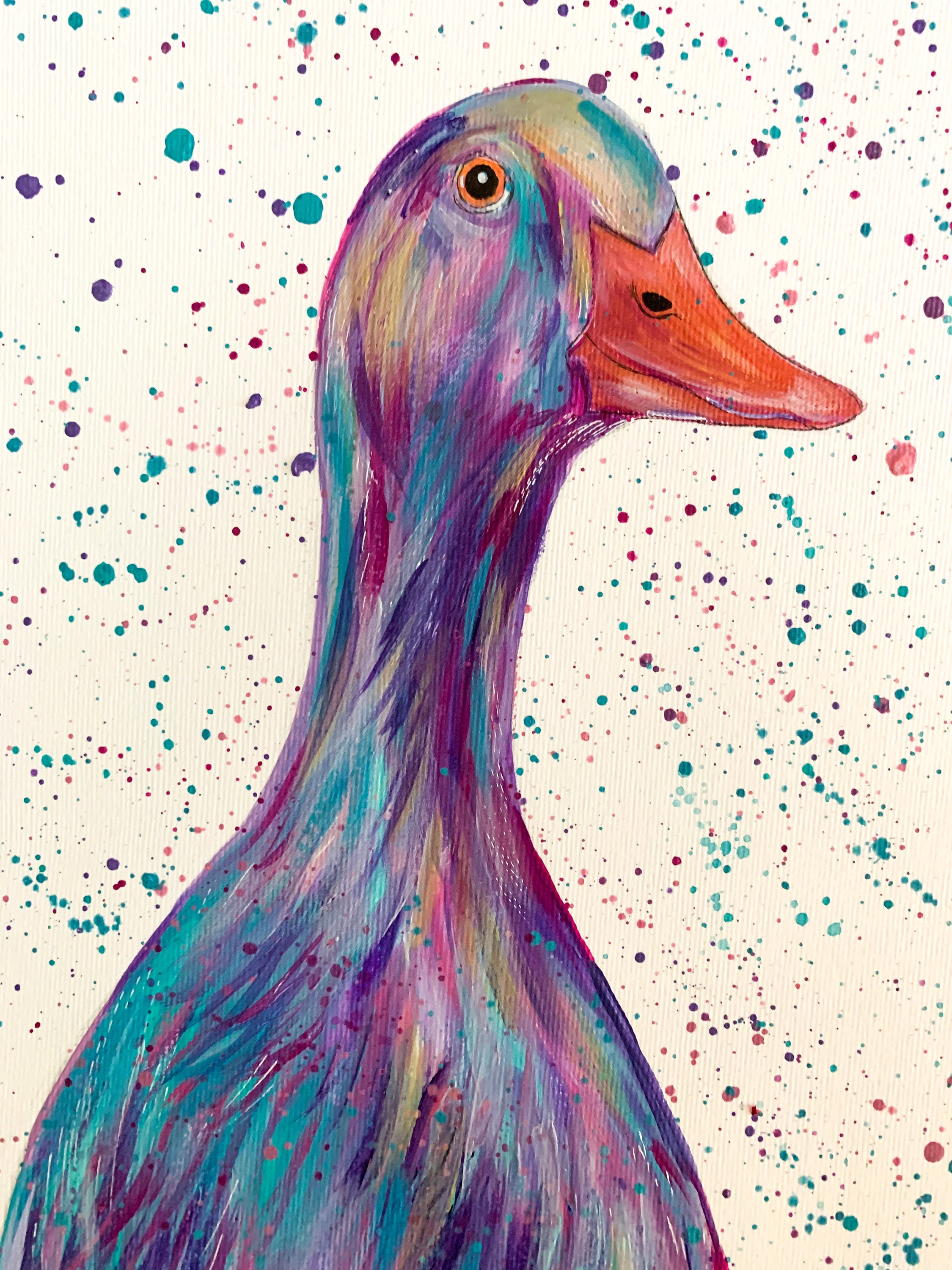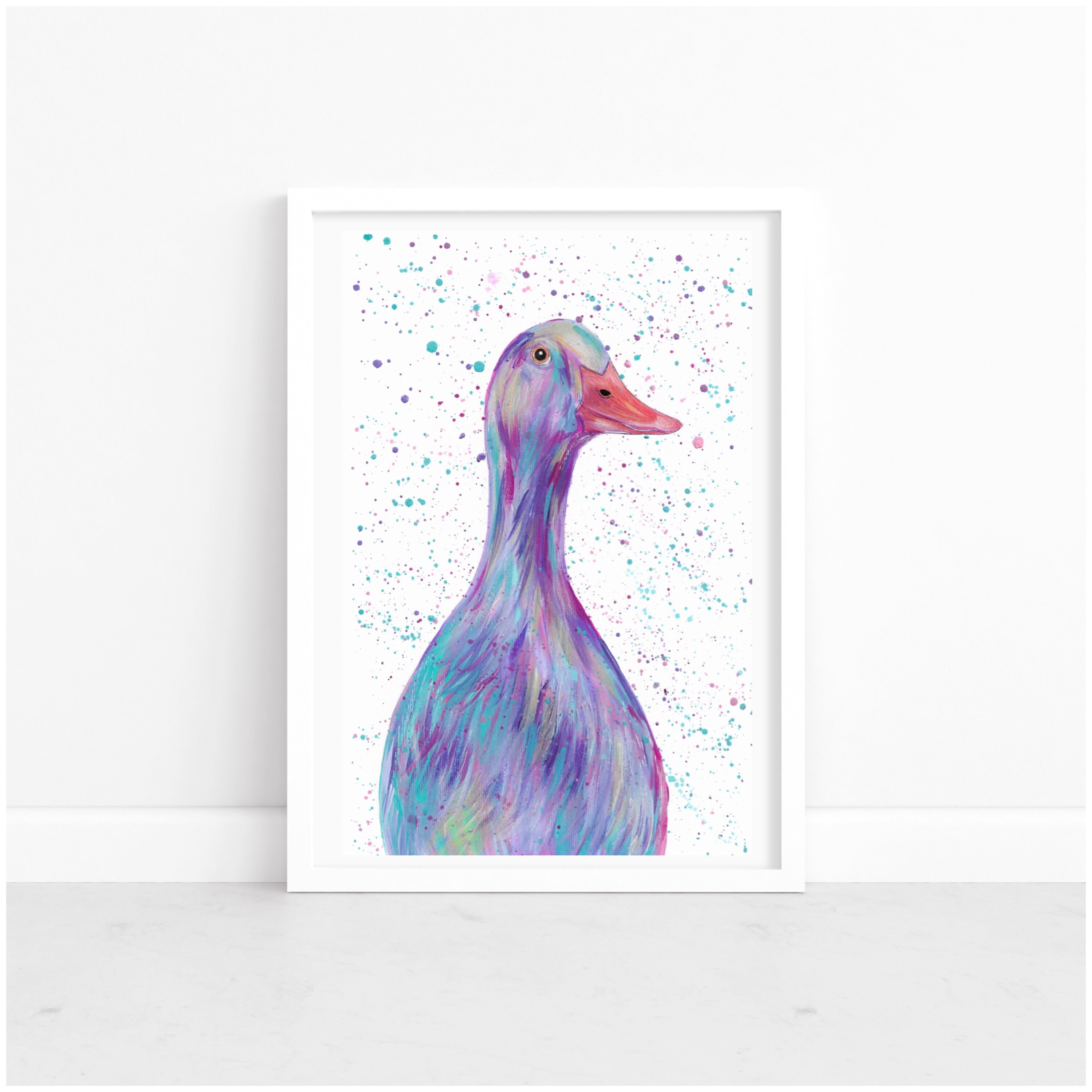 An original colourful acrylic painting of a Runner Duck painted in pastel shades of purple, green and pink!