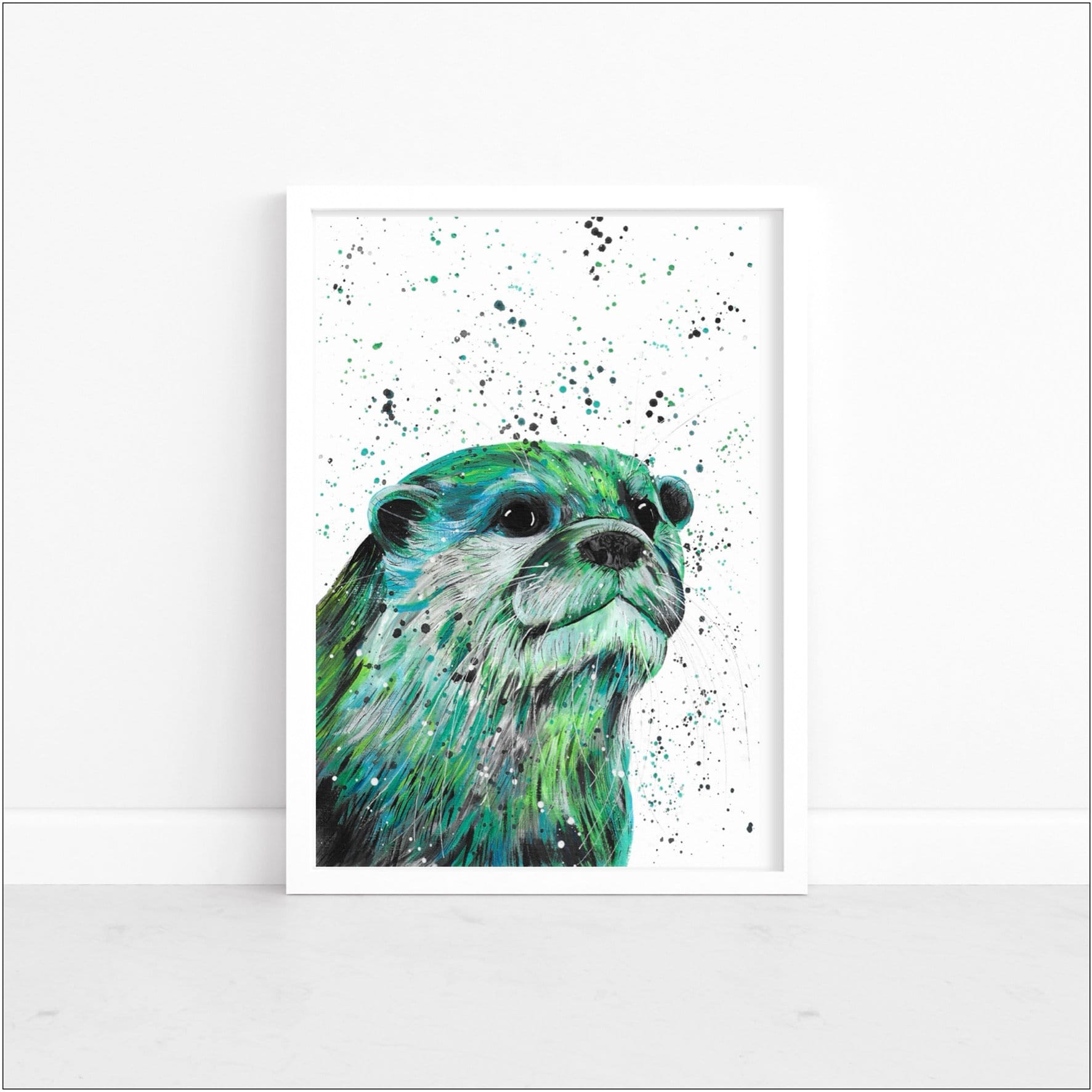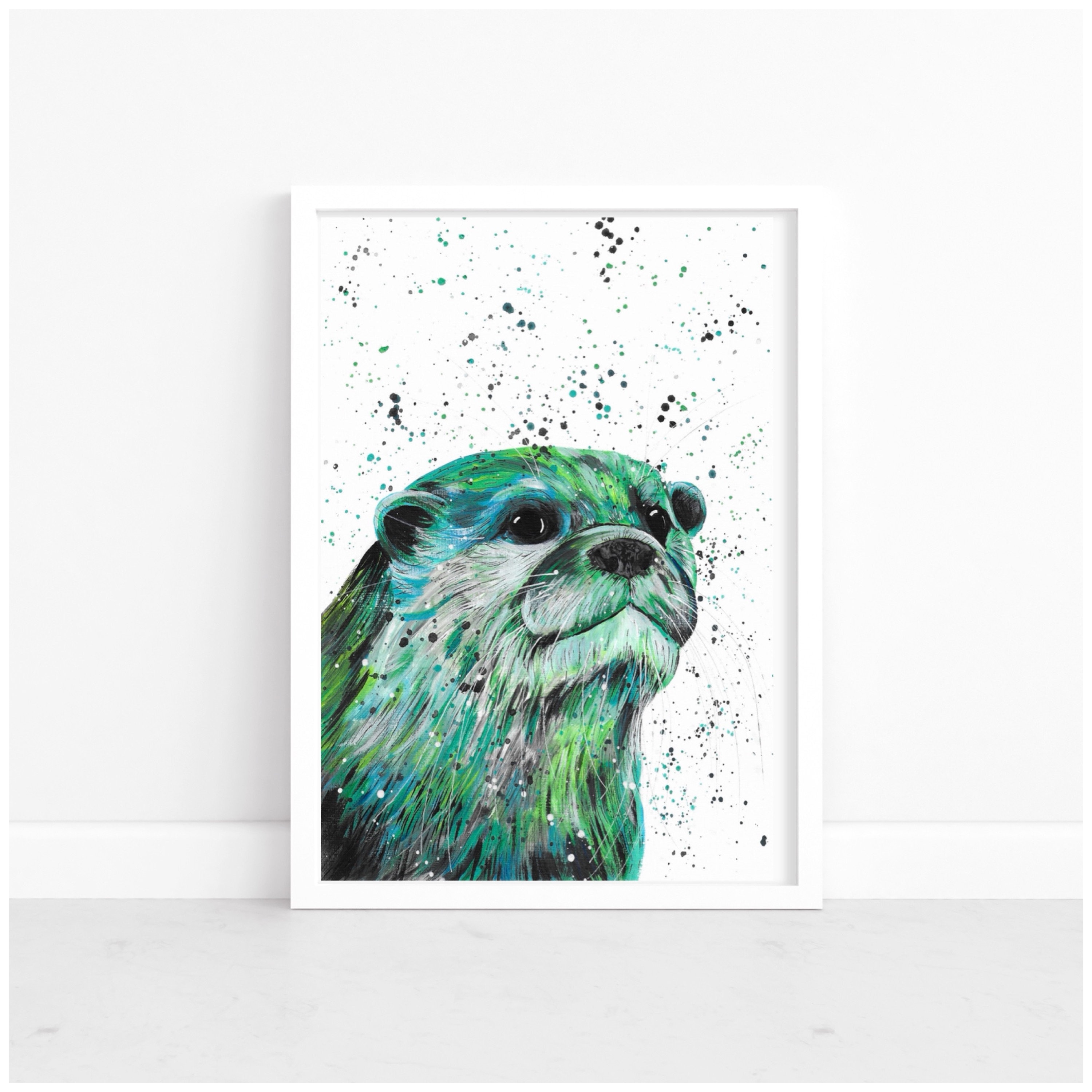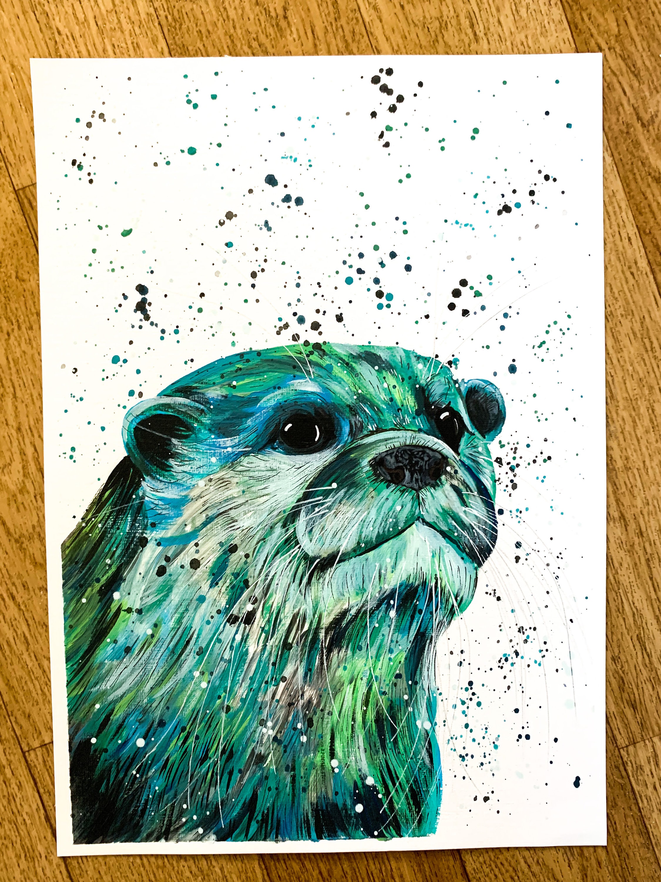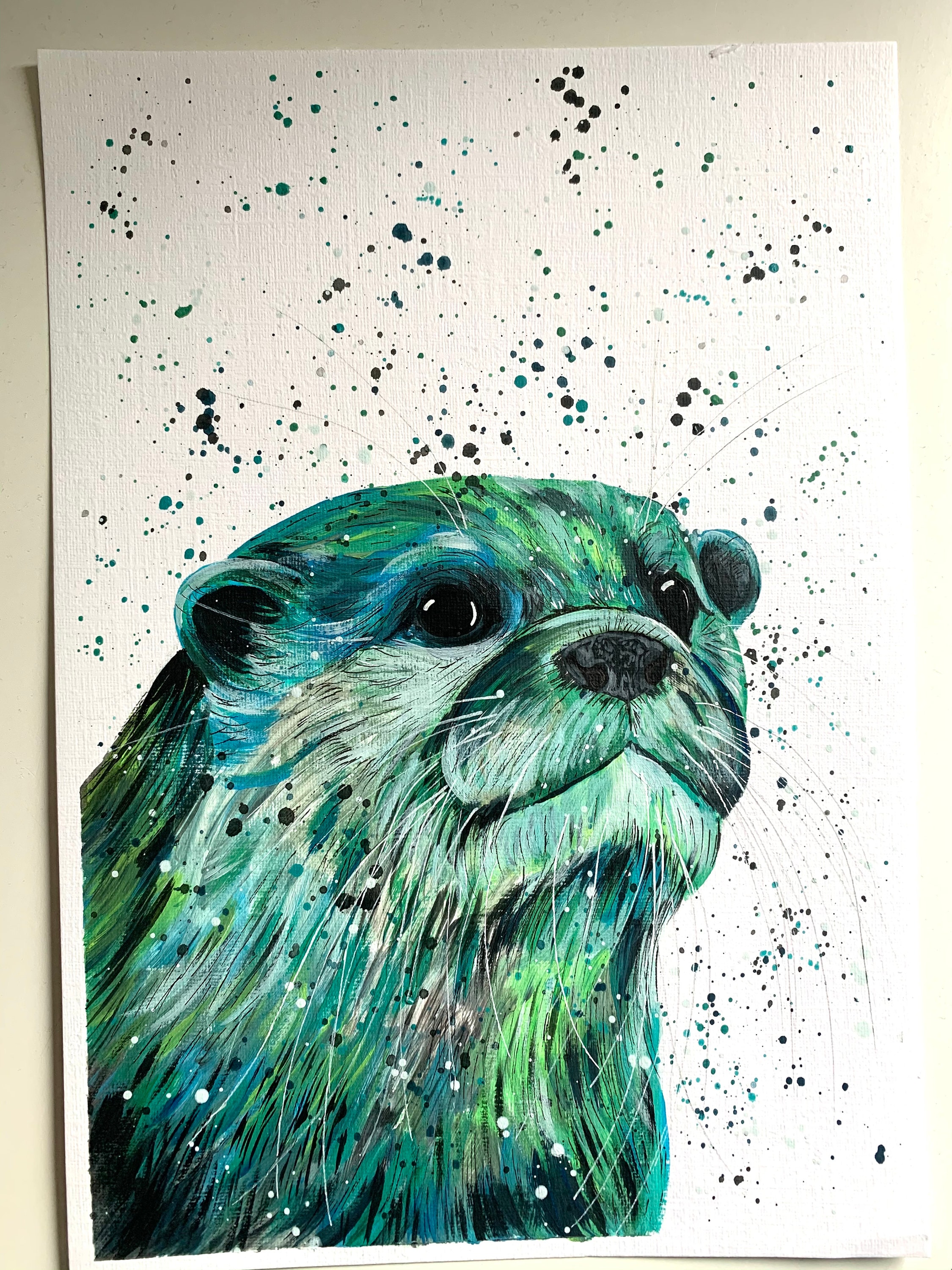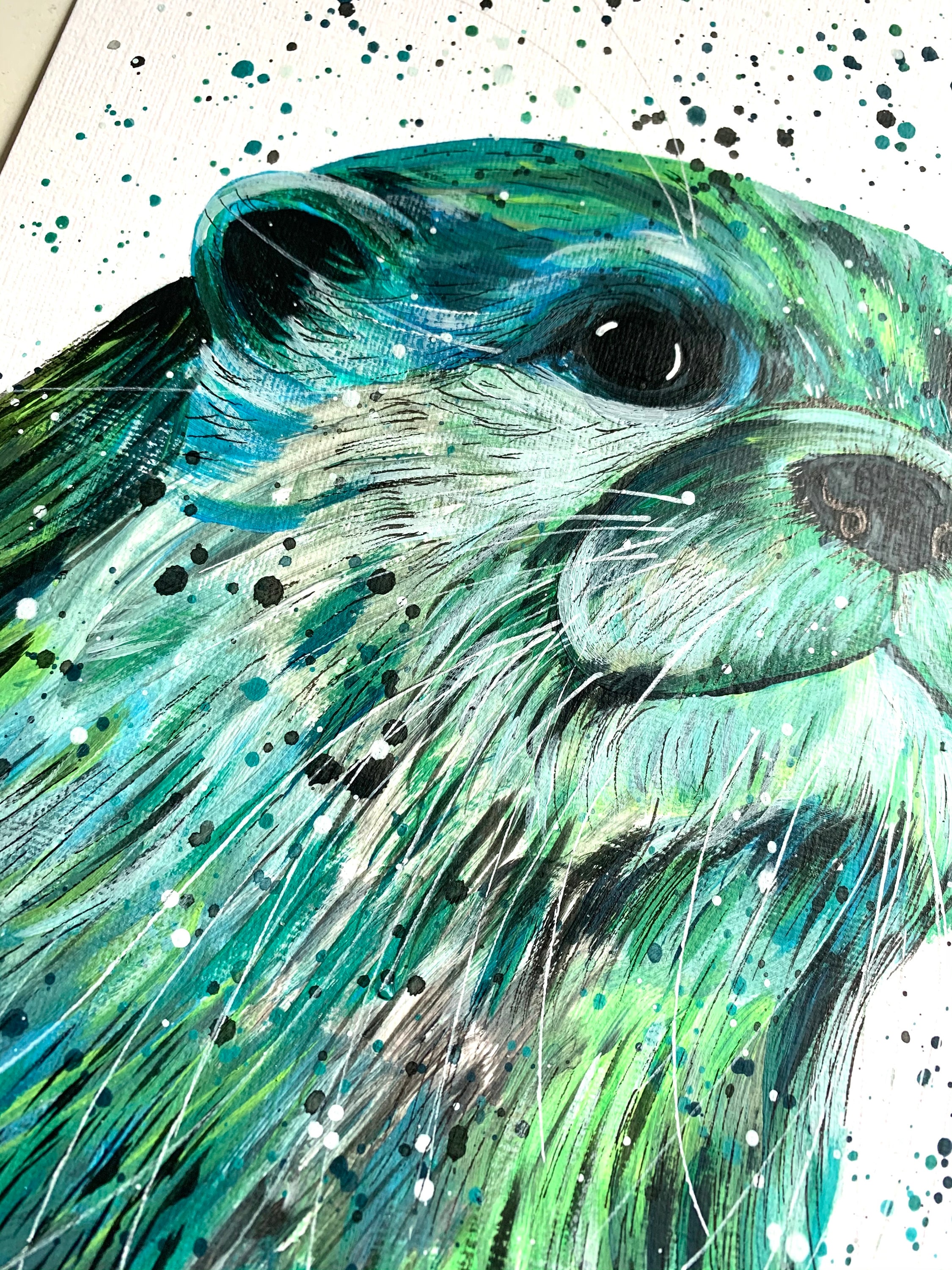 An original colourful acrylic painting of an Otter painted in shades of green and blue. Finished off with pen and pencil detailing.